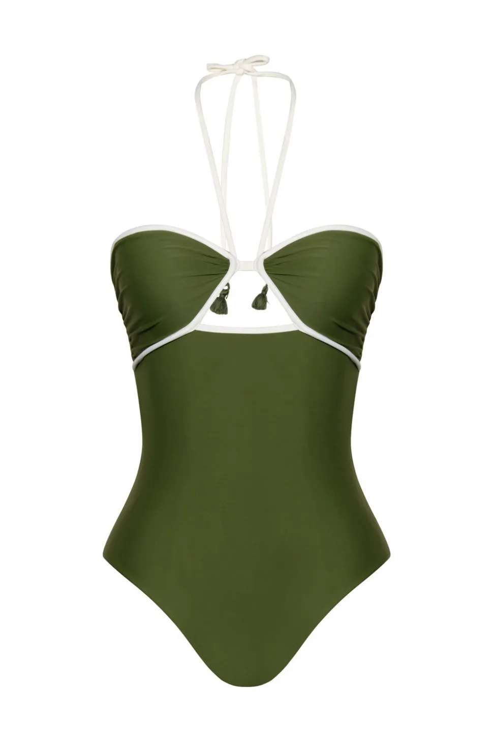 Styling Notes:Indulge In Beachside Allure With This Military Green And Nude One-Piece Swimsuit, Adorned With Embroidered Tassels And A Delicate Front Cutout. Ideal For Mixing And Matching With Bottoms From The Collection, Its Simple Yet Charming Design Adds Versatility To Your Vacation Wardrobe.Size And Fit:True To Size, Please Consult Our Size Chart For Reference.Product Details:Embroidered Tasselsclosure: Tie Fasteningcomposition: 80% Polyamide, 20% Elastanefabrication: Lycracolor: Rainforest Greenhand Washmade In Colombiashipping And Return Policies:Complimentary Shipping And Returns. Terms And Conditions Apply. Please Visit Our Shipping And Return Policies.