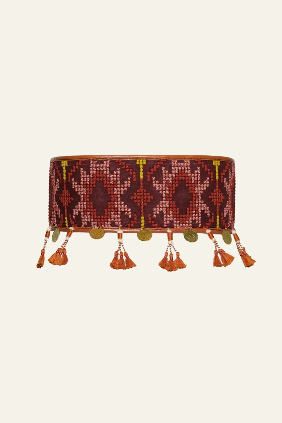 Styling Notes:This Vegan Leather Belt Is Perfect For Dressing Up Dresses And Skirts. An Adventurer'S Classic Design For A Timeless Look. Its Intricate Hand Embroidery Pattern And Clean Silhouette Are Sure To Make A Statement.Product Details:Dimensions: Width 10 Cmclosure: Front Bucklecomposition: 50% Polyester, 20% Cotton, 10% Polyurethane, 10% Glass, 10% Metal Alloysfabrication: Vegan Leather And Embroidery Cotton Voilecolor: Nogal Nut/Burgundy/Pinkdry Cleanmade In Colombiadue To Its Natural Materials And Handcrafted Nature, Sizes, Patterns And Colors May Differ, Contributing To Each Product'S Individuality.Shipping And Return Policies:Enjoy Complimentary Shipping And Returns. Terms And Conditions Apply. To Learn More, Please Visit Our Shipping And Return Policies.