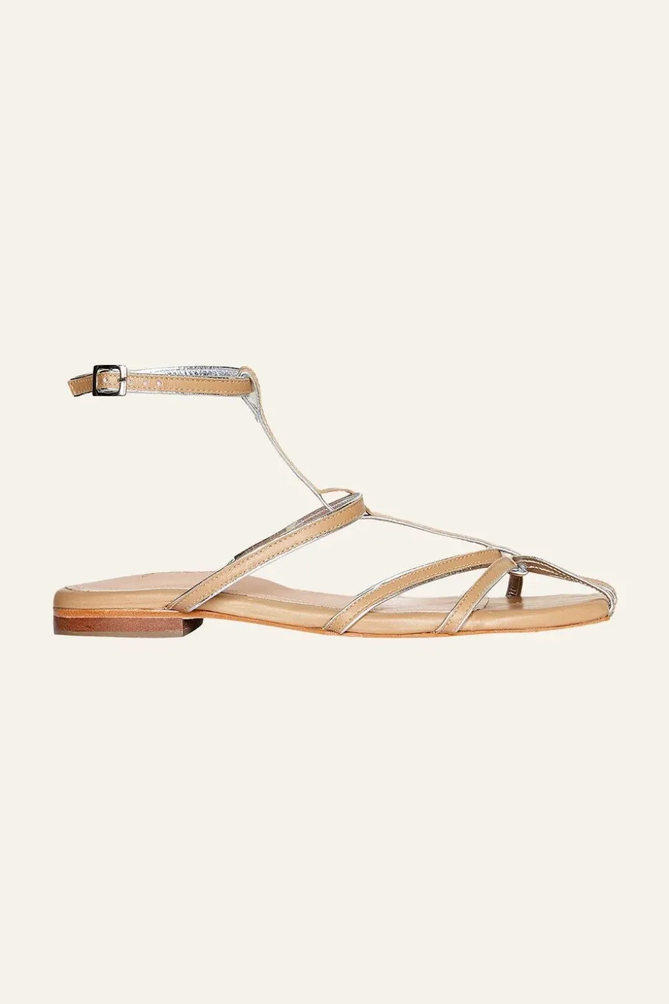 Styling Notes:These Flat Sandals With A T-Strap And Ankle Ties Are Designed To Add A Playful Charm To Your Outfit. Inspired By Vintage Aesthetics, These Sandals Feature A Delightful Combination Of Straps And Squared Toes. With Their Distinct And Fashionable Appearance, They Effortlessly Elevate Any Occasion.Size And Fit:True To Size, Please Consult Our Size Chart For Reference.Product Details:Closure: Buckle Regulationcomposition: Upper: 100% Cow Leather, Lining: 100% Cow Leather, Insock: 100% Cow Leather, Outsole: 100% Cow Leatherfabrication: Leather Sandalscolor: Nude/Silverdry Cleanmade In Colombiashipping And Return Policies:Complimentary Shipping And Returns. Terms And Conditions Apply. Please Visit Our Shipping And Return Policies.