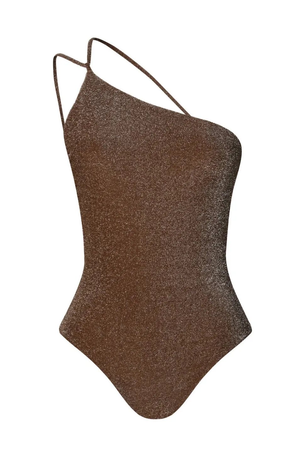 Styling Notes:Indulge In Effortless Allure With This One-Shoulder One-Piece Featuring A Metallic Shimmer That Beautifully Accentuates Your Shoulders. It Offers A Modern Interpretation Of Classic Swimwear, Adding A Touch Of Sophistication To Your Beach Look.Size And Fit:True To Size, Please Consult Our Size Chart For Reference.Product Details:Closure: Slip Oncomposition: 66% Recycled Nylon, 26% Metallic, 8% Spandexfabrication: Lycra Lurexcolor: Chocolatehand Washmade In Colombiashipping And Return Policies:Complimentary Shipping And Returns. Terms And Conditions Apply. Please Visit Our Shipping And Return Policies.